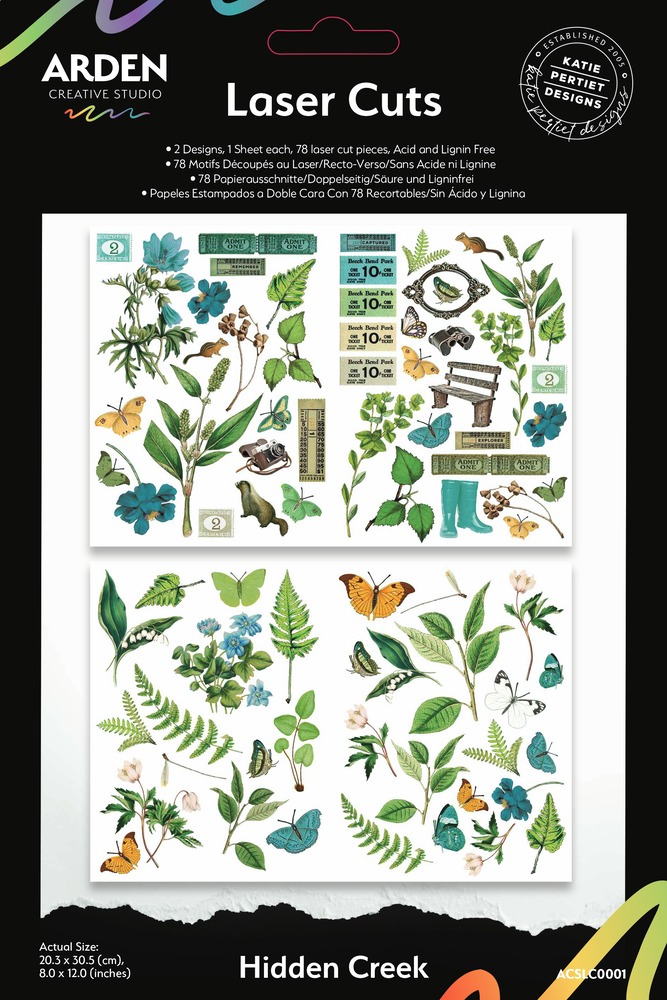 Transform your creative projects with the Laser Cuts pack from Arden Creative Studio, part of the enchanting Hidden Creek collection designed by Katie Pertiet. This pack features 78 precisely pre-cut pieces across two 12x8-inch sheets (folded to 6x8 inches for easy storage), showcasing a stunning array of botanical designs, butterflies, vintage tickets and labels as well as plenty of other delightful elements. Each piece is crafted for easy removal from the holding card, making it simple to incorporate intricate details into your scrapbooks, journals, and mixed media creations. The diverse designs add charm and dimension to any project, allowing you to express your creativity with elegance and precision. Whether you’re embellishing a layout or creating a standout focal point, these laser-cut pieces enhance your projects with the timeless beauty of the Hidden Creek aesthetic.