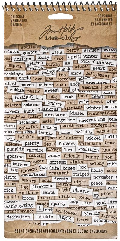This tablet of word stickers from Tim Holtz contains some of the most commonly used seasonal words. Each word is 1/4 inch tall making them great for adding captions on scrapbook layouts. The spiral-bound tablet includes six sheets of stickers: two each of three word sets (one is white cardstock and one is Kraft paper). Contains a total of 924 cardstock word stickers!