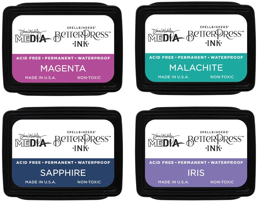 Dina's Faves BetterPress Ink Mini Set by Dina Wakley includes four 1.25 x 1.75-inch ink pads in colors of Cheddar, Elephant, Stoked and Turqoise. Designed to coordinate with the acrylic paints and glosses in Dina Wakley's line of art supplies from Ranger Ink, these signature colors are perfect for capturing the bright and colorful tone Dina is famout for. These inks are specially formulated Ranger Archival Ink made for the BetterPress Letterpress System. They are acid free, permanent, and waterproof. Approximate Size: 3.18 x 4.45 cm.