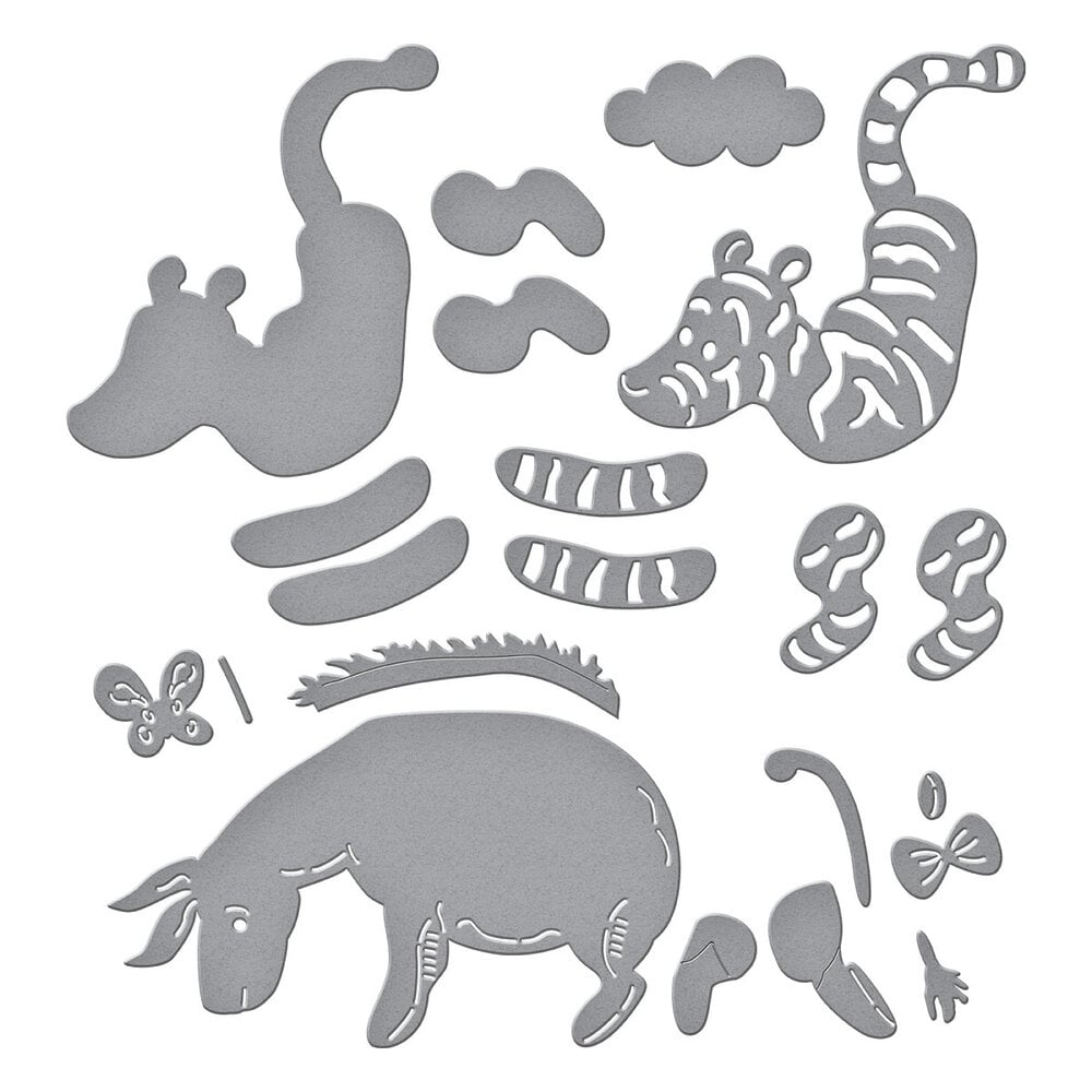 Tigger & Eeyore Etched Dies are part of the Say Cheese Classic Pooh Collection. This set of nine thin metal cutting dies creates the dynamic duo of Pooh's friends, Tigger and Eeyore. Approximate Sizes: Tigger: 7.30 x 8.70 cm :: Eeyore: 9.80 x 5.60 cm :: Cloud: 3.40 x 1.70 cm :: Bow: 1.70 x 1.20 cm :: Butterfly: 1.90 x 1.70 cm