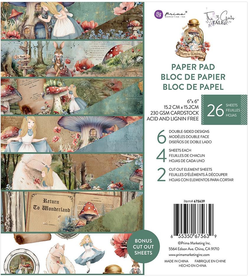 The Return to Wonderland 6”x6" Paper Pad by The 3 Girls Tale for Prima Marketing includes the same stunning, hand-painted designs as the 12x12" version, scaled down for even more creative possibilities.