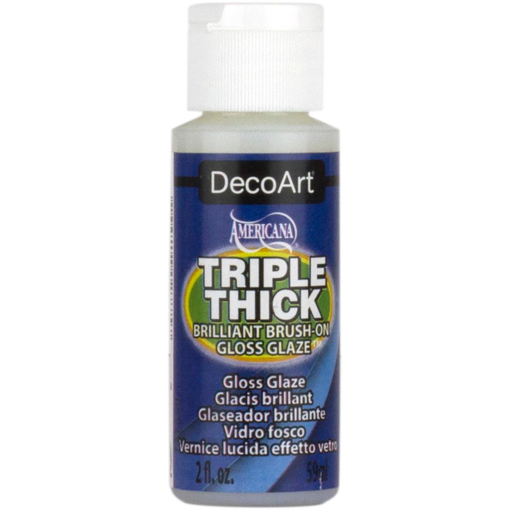 DECOART-Triple Thick Brilliant Brush-on Gloss Glaze. This high gloss clear glaze is perfect for adding a protective finish with the look of depth to hard craft surfaces. This triple thick formula really is three times as thick as the usual glaze yet it dries quickly, resists cracking, only one coat is needed and it does not yellow with time. Glaze may be used on wood, wicker, metal, paper-mache, plaster, resin, bisque, ceramics, painted china and other surfaces. This package contains one 2oz/59ml bottle.