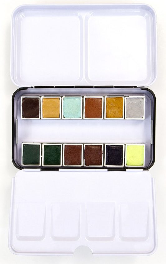 These artist grade, high quality and highly pigmented watercolor pans are sized perfectly for artists on the go. The professional grade paints provide bright, intense, smooth and long lasting colors that work beautifully for any art or mixed media project. The Essence Collection of colors is perfect for painting florals and landscapes. Included in the pack are 12 colors, a tin box that features two fold out mixing palettes, and a black swatch card.