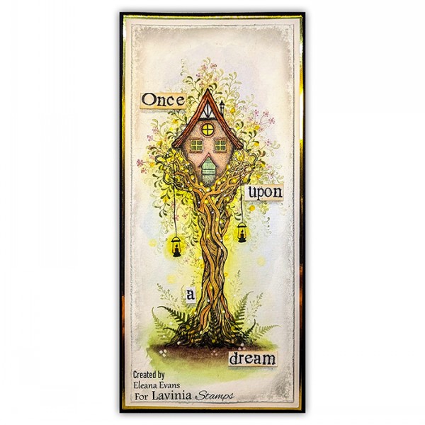 An individual stamp featuring an illustration of a house in an enchanted tree. The house with a pointed roof and chimney sits atop the trunk of a tree. The tree branches form a nest around the base of the tree. The trunk is made up of interwoven curving branches. This stamp works beautifully with Snowy Fir Tree Small and Woodside View. Stamp size: 14.5cm x 5.6cm.
