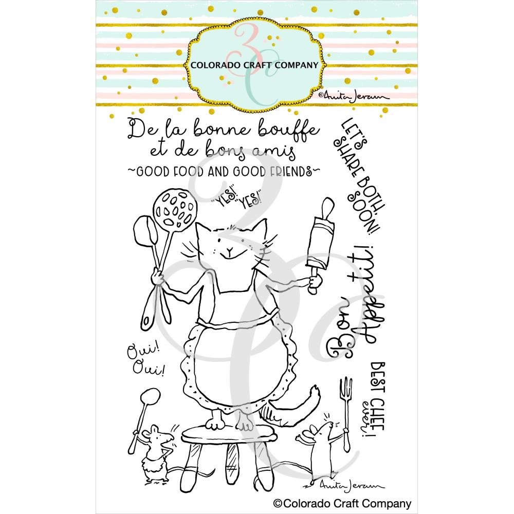 This set includes clear photopolymer stamps with a cat in an apron and two mice holding kitchen utensilson a 4” x 6” backing sheet. It includes 7 stamps, 1 image and 6 sentiments. The largest stamp is 3.3 x 4.5 inches and the smallest stamp is 0.75 x 0.5 inches. The stamps can be used with the coordinating Bon Appetit die set sold separately (AJ637-D). Sentiments included in the set: De la bonne bouffe et de bons amis, Good food and good friends, Let's share both soon, Bon Appetit, Oui Oui, Yes Yes, and Best chef ever!