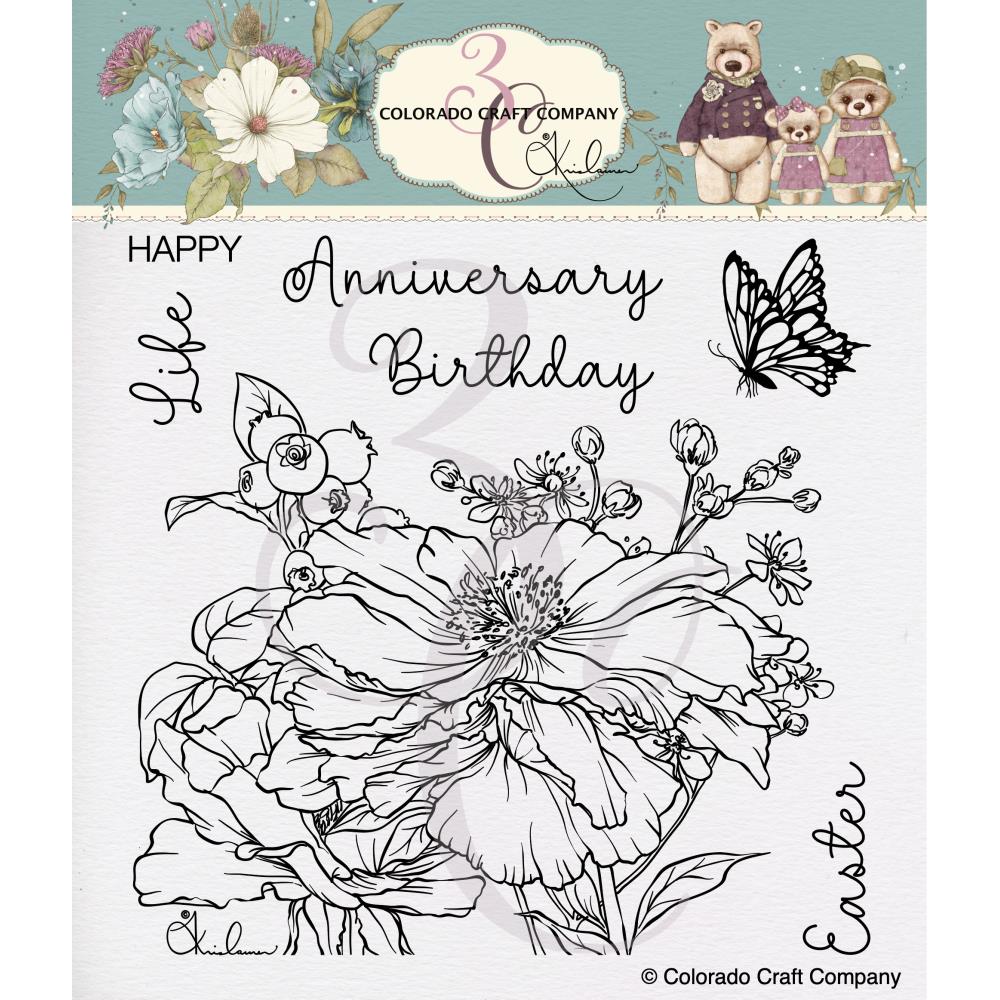 The set includes clear photopolymer stamps with a large peony flower and a butterfly on a backing sheet measuring 6 x 6 inches. It includes 7 stamps: 2 images and 5 sentiments. The largest stamp is 5.5 x 4.5 inches and the smallest stamp is 1 x 0.6 inches. The stamps can be used with the coordinating Happy Peony die set sold separately (KL605-D). Sentiments included in the set: Happy, Life, Anniversary, Birthday and Easter.