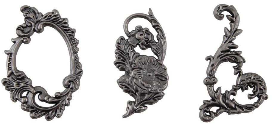 The vintage-inspired Tim Holtz Adornments Ornate includes a set of 3 charming and unique vintage-style charms that are perfect for adding a touch of nostalgia and elegance to your mixed media and jewelry creations.